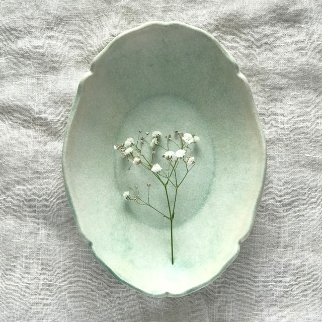 控えめな輪花のデザインが施された、オーバル型の浅鉢。 薄浅葱(うすあさぎ)色という淡いミントグリーンで、白浜に打ち寄せるさざ波のような、淡い水色と白のグラデーションが爽やかです。手びねりの穏やかなラインが優しさを感じさせてくれます。 副菜・サラダ・デザートなど、様々な場面で活躍してくれるサイズ感。朝食に、フルーツを盛り合わせたり、ヨーグルトやグラノーラなどを入れても食卓のアクセントになると思います。 サイズ:20×14.5×H3.5cm 素材:陶器 電子レンジ× 食洗機× オーブン×