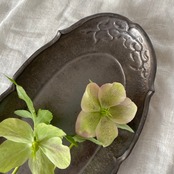 いっちんで描かれたボタニカル模様がアクセントになった、アンティーク感漂うスリムなオーバルプレート。鈍く光るブロンズ色、重厚感のある佇まいがシックな雰囲気です。