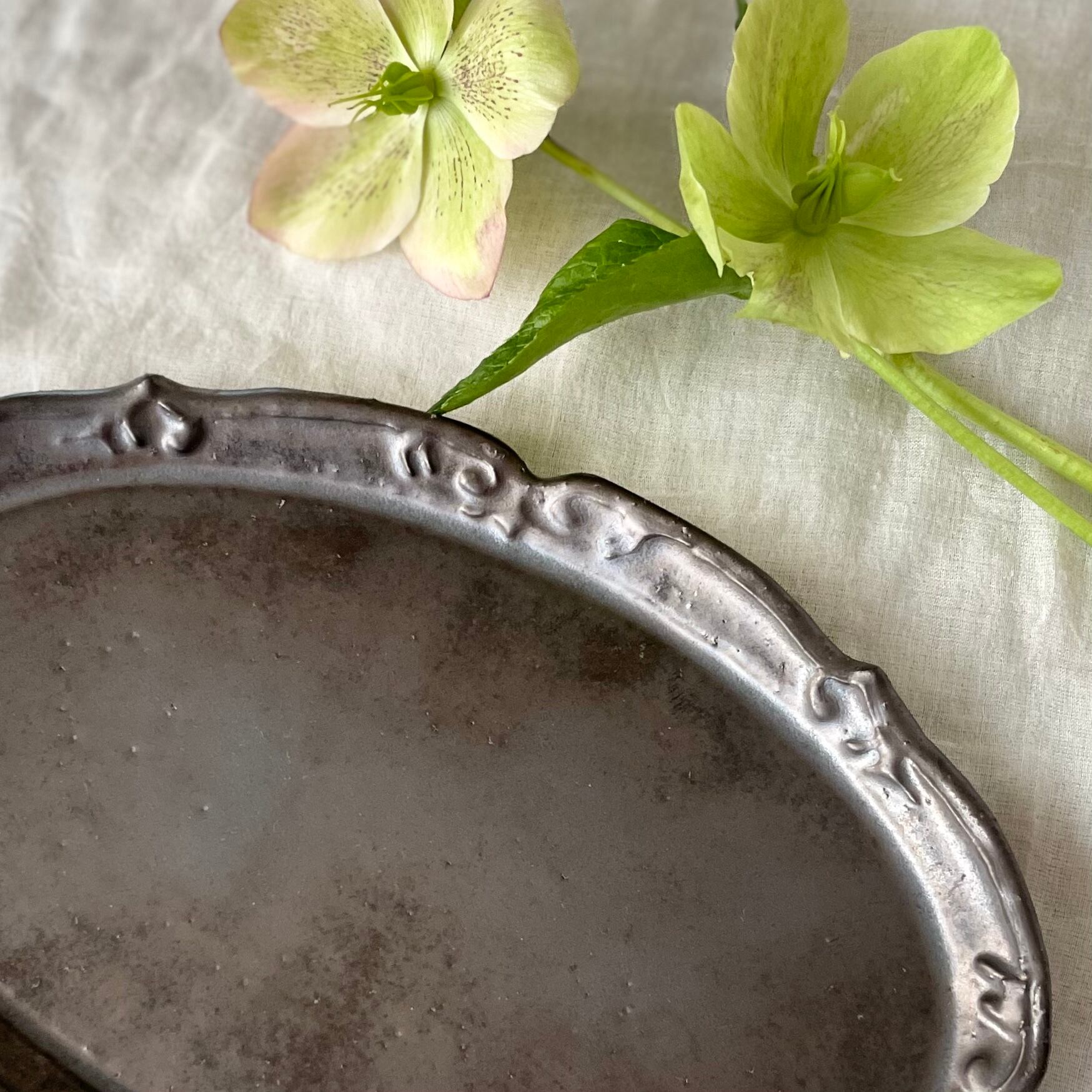 稜花のデザインとクラシカルな模様が施された、アンティーク感漂うオーバルプレート。